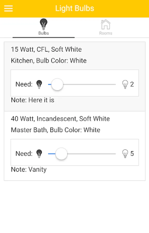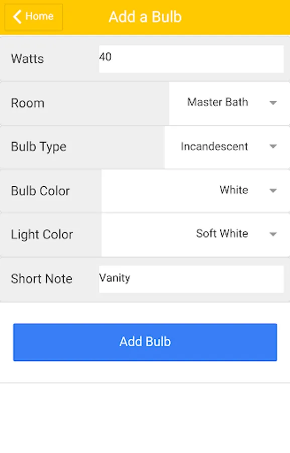 Bulbify "The Light Bulb Tracker" helps you track the many light bulbs you have in and around your house. Never forget the wattage, light color, or bulb type.