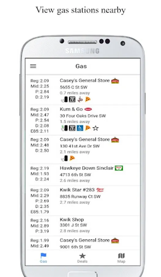 2) View list of Deals in your area, shown by distance from you; tap a deal to get more info and station info including tap to call and tap to navigate