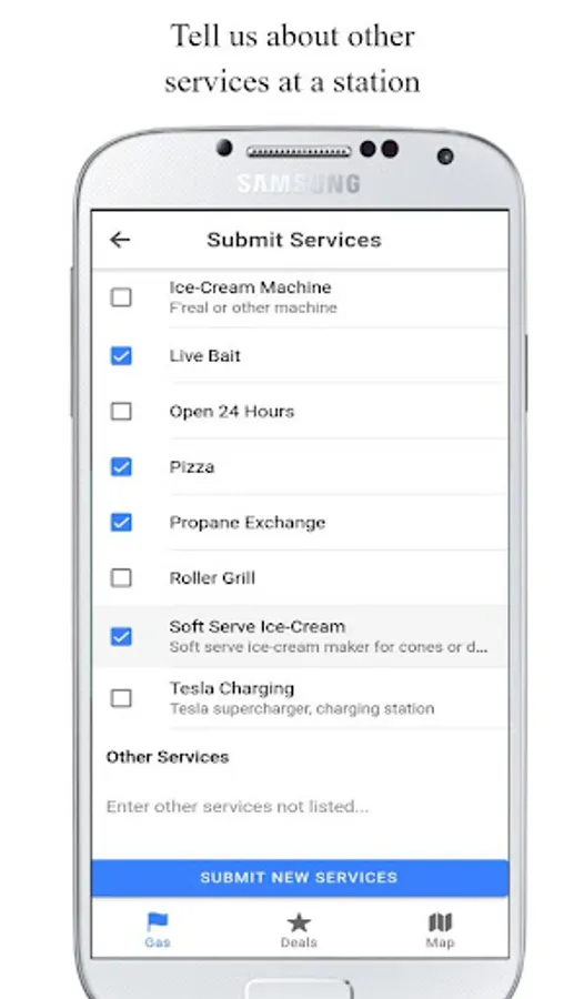 6) See services available at a station, including Pizza, Ice-cream, Tesla charging, propane refill, live bait, and more. Submit a new service for a station if you don't see it lised.