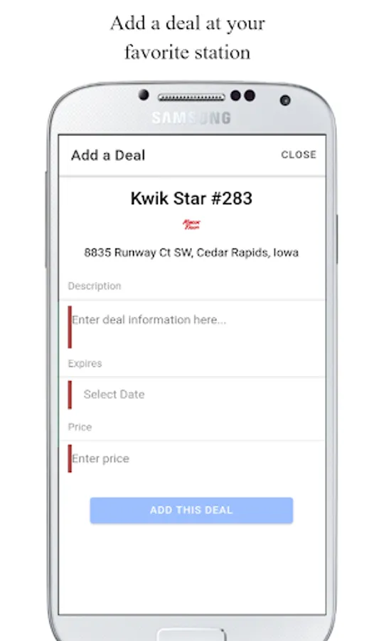 • Station deals come and go all the time. If you can't find one in your area, use "Contact Us" in the app to send us your City/State and we'll look for some.