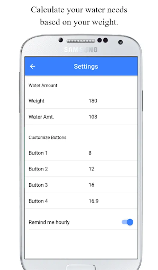 * Enter the number of ounces you want to drink in the settings page. If you are not sure, enter your body weight and the app will calculate an estimate based on that.