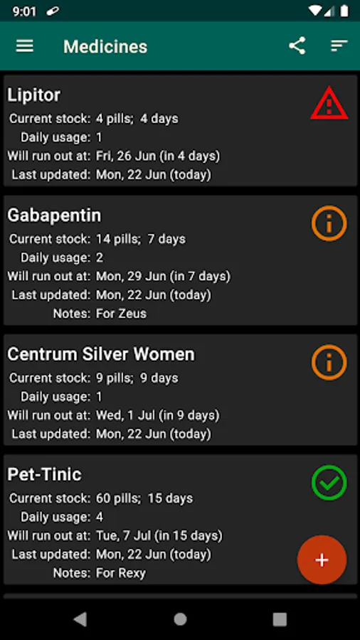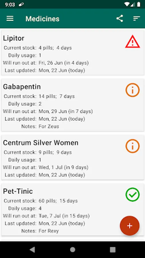 From this information MedsStockTracker tries to predict when your stock will run low, and it alerts you in advance so you will have plenty of time to re-stock before your medicines will run out.