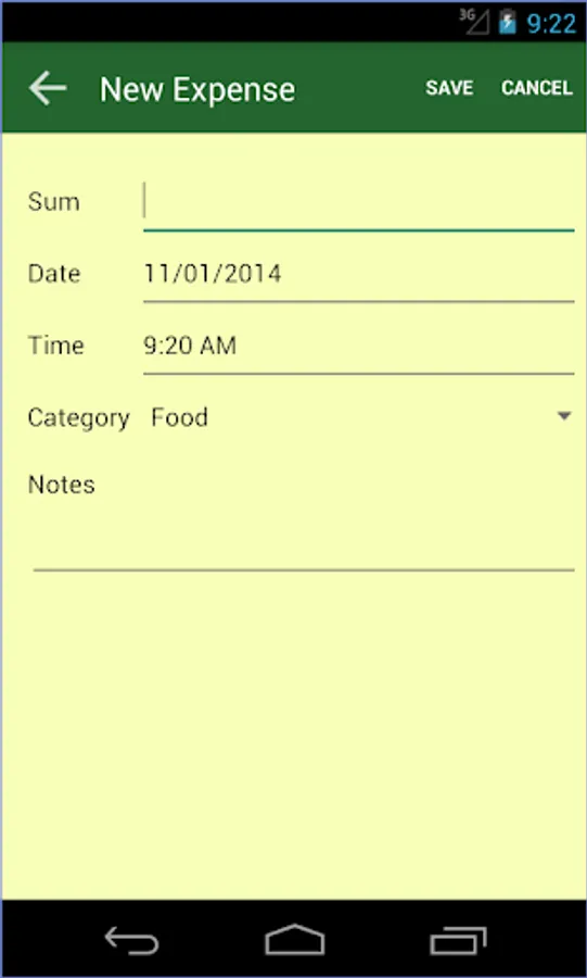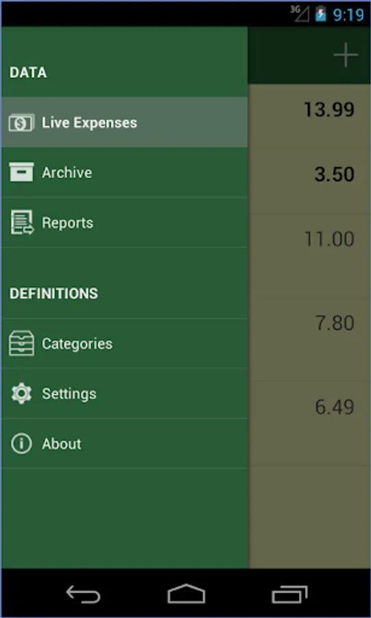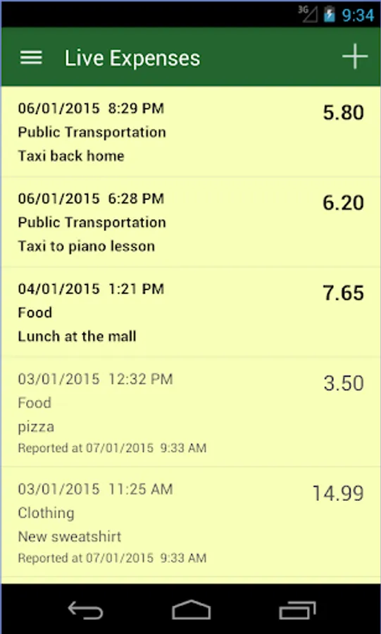 Documenting an expense is extremely easy and fast. It takes only a few clicks. Every expense can be attributed to a predefined category (public-transportation, food, etc), and may be accompanied by a note that explains what it was.