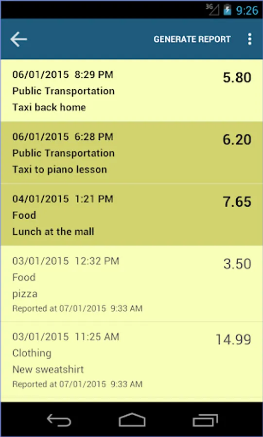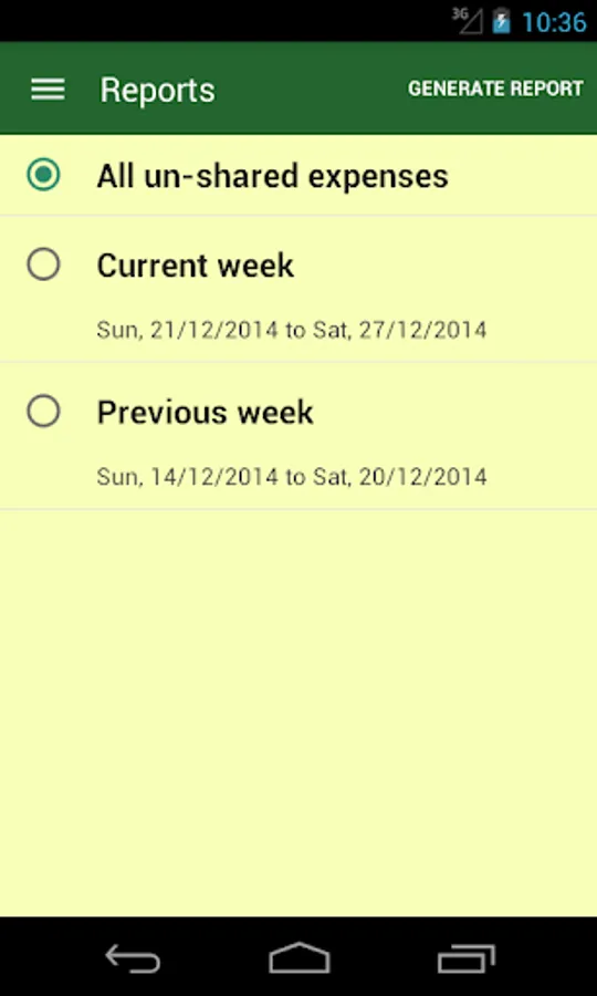 Reports can be generated from specific hand-picked expenses, or can be weekly (for current or previous week). After a report is generated it can be sent or shared with any sharing option available on the phone such as email or WhatsApp.