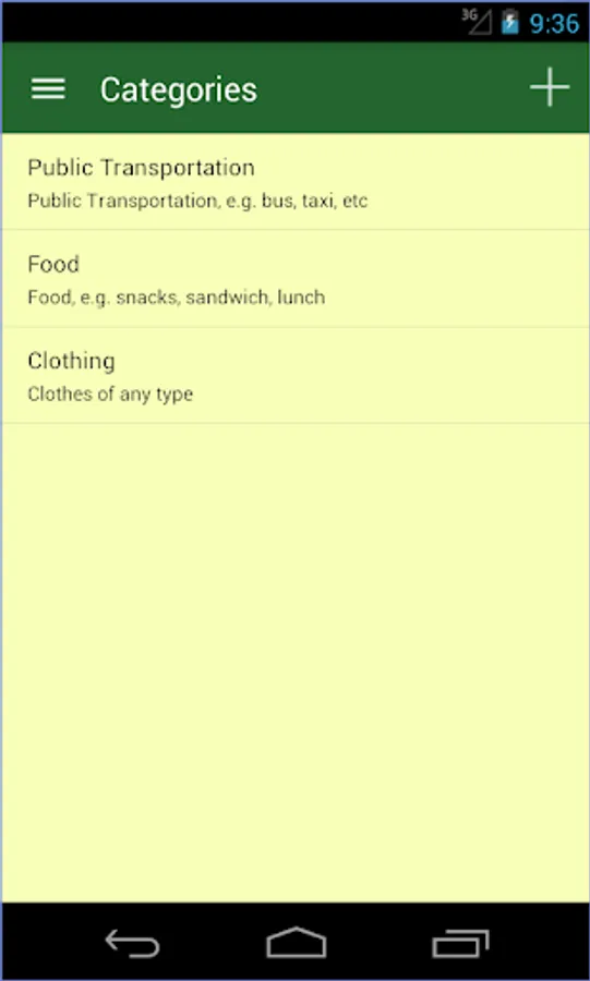 Expense categories such as public-transportation, food, cloths etc, can be freely added.