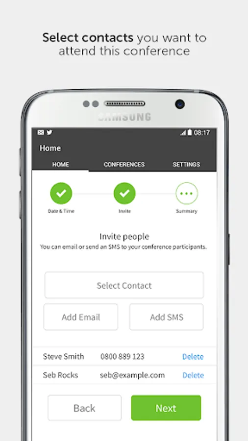 - Invite Participants from your Contacts, using either SMS or E-Mail