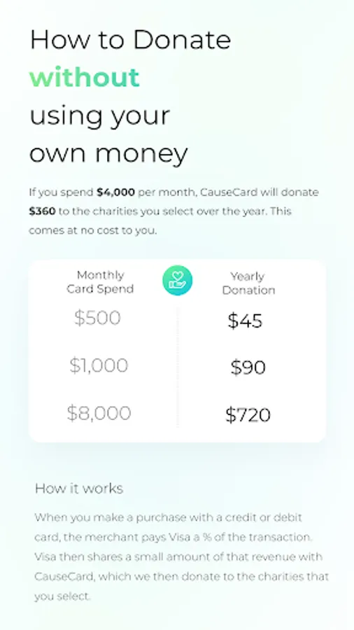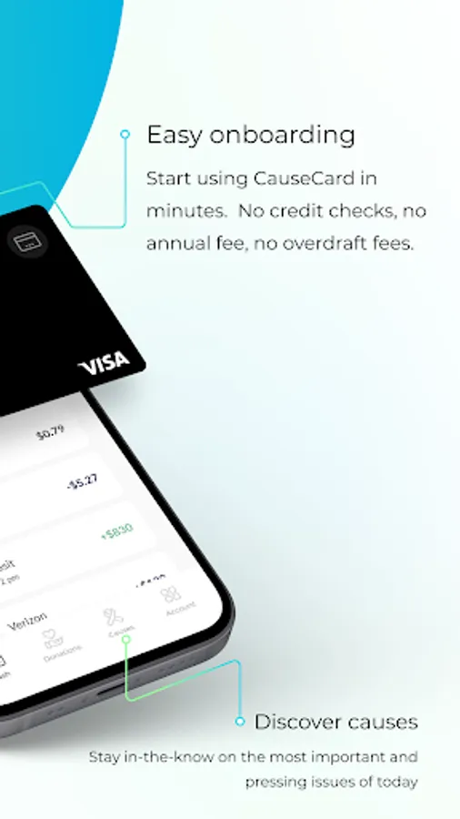 Get the CauseCard app in minutes; no credit checks, no monthly or yearly fees, no overdraft fees.