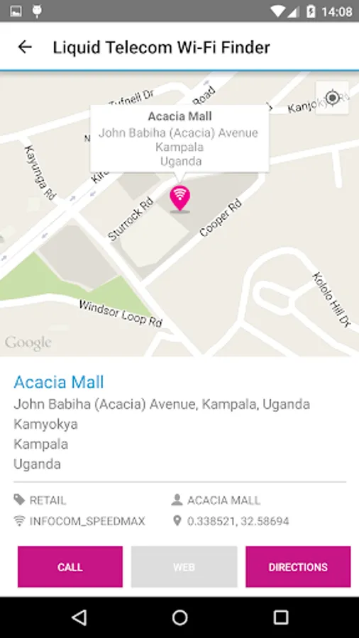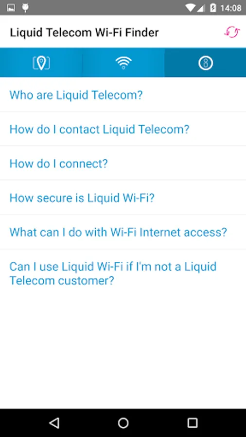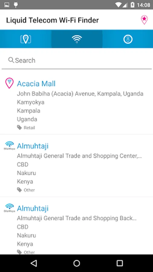 Wi-Fi hotspot finder from Liquid Telecom; you can find hotspots where you can get online via either a map or a list of locations, with address, type of location, and contact details for each.