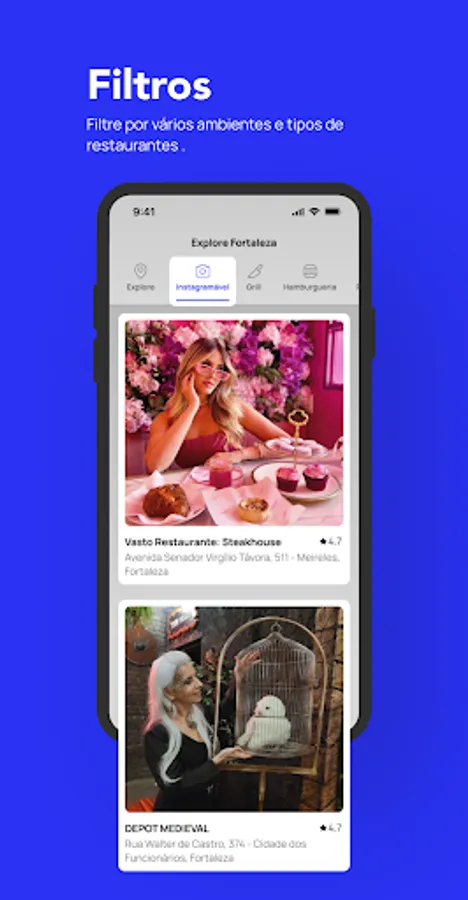 With advanced filters, you can find the ideal place according to your tastes, be it instagrammable, steak house, near the beach, exotic drinks, themed drinks, coffee shops and much more.