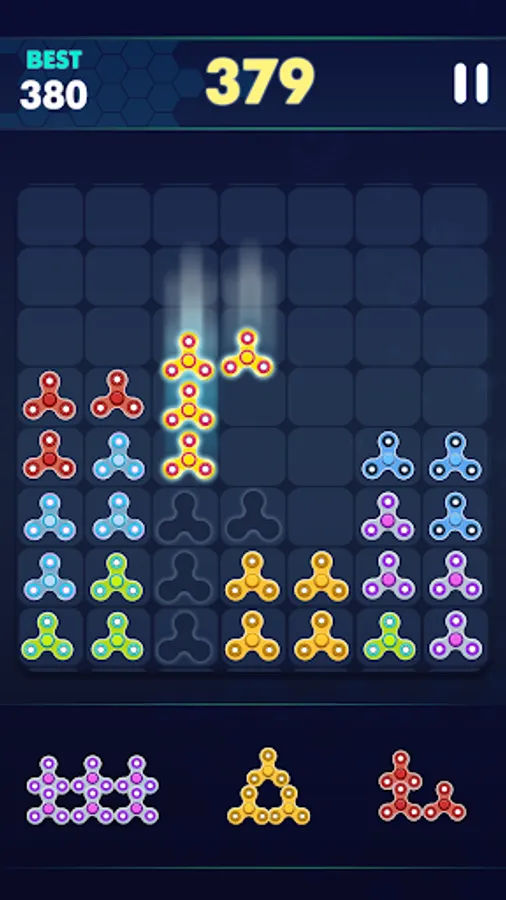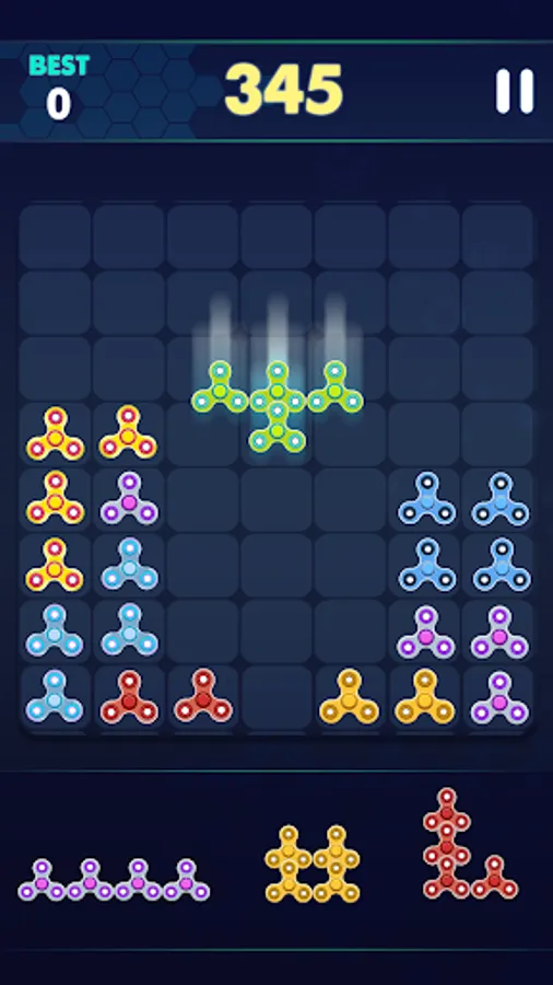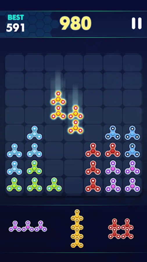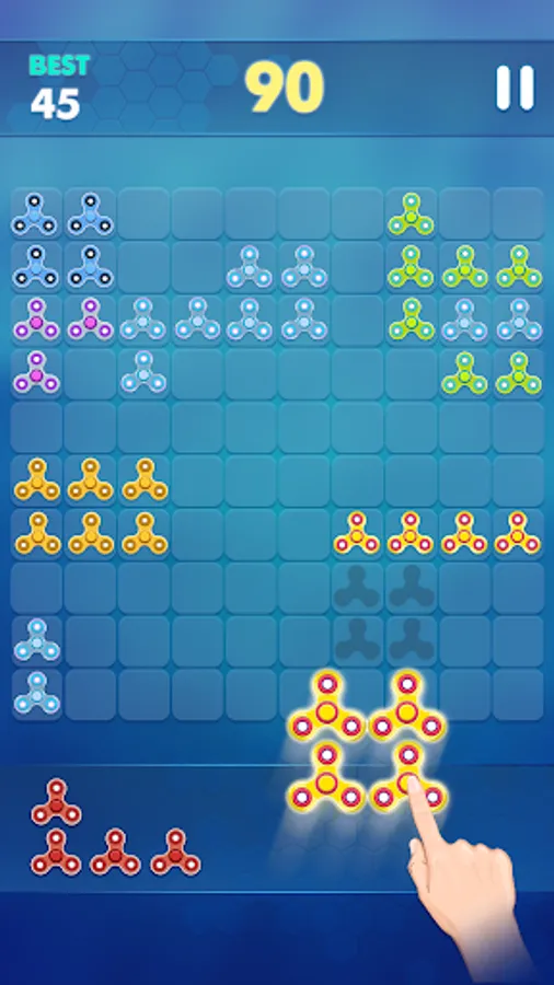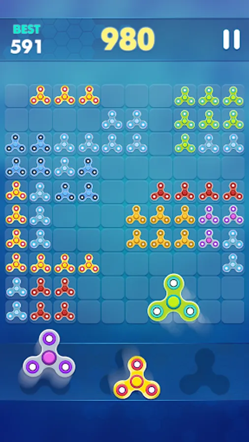 The goal is to drop fidget spinner blocks in order to create and destroy full lines on the screen both vertically and horizontally. Don't forget to keep the blocks from filling the screen.