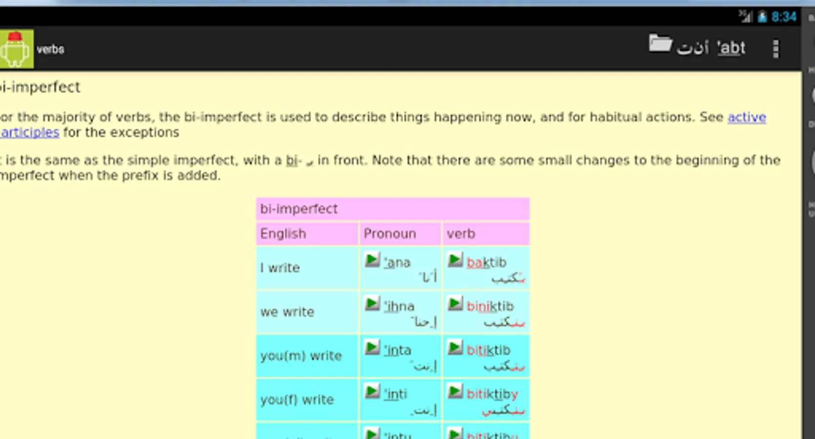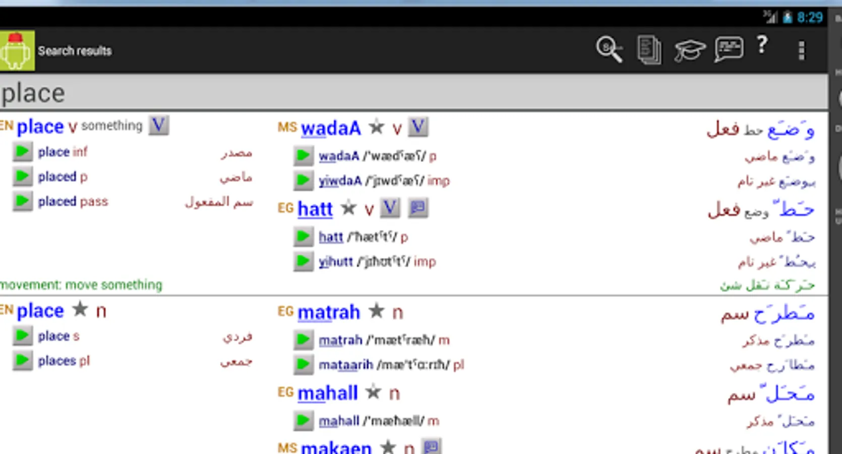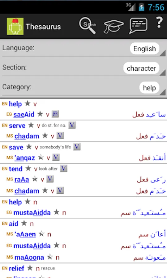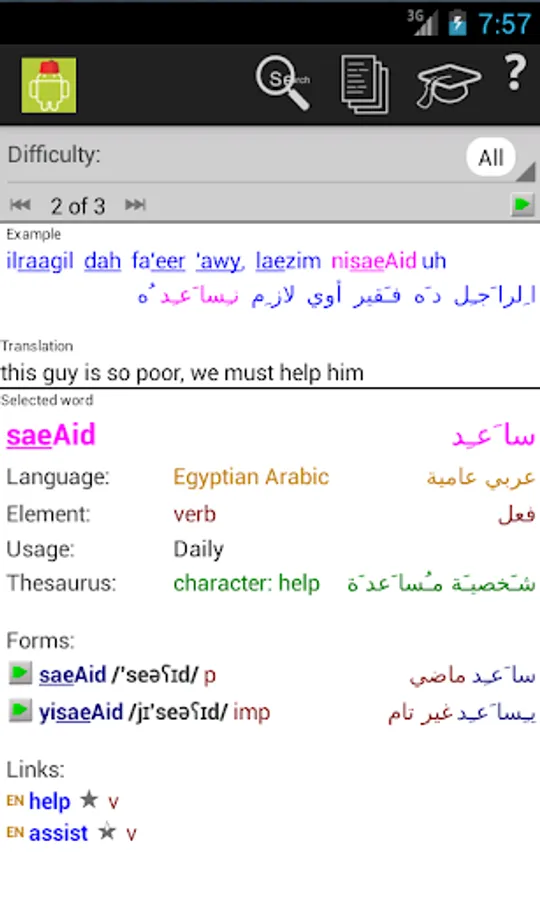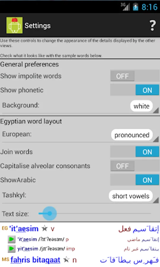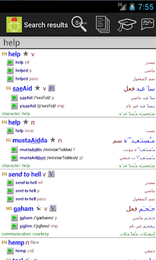 The Egyptian Arabic/English and English/Egyptian Arabic dictionary is comprehensive and up to date. Words are displayed in arabic, transliterated and phonetic writing, with recordings of all of the main word forms. For most verbs, a full translation of all cases and tenses is available.