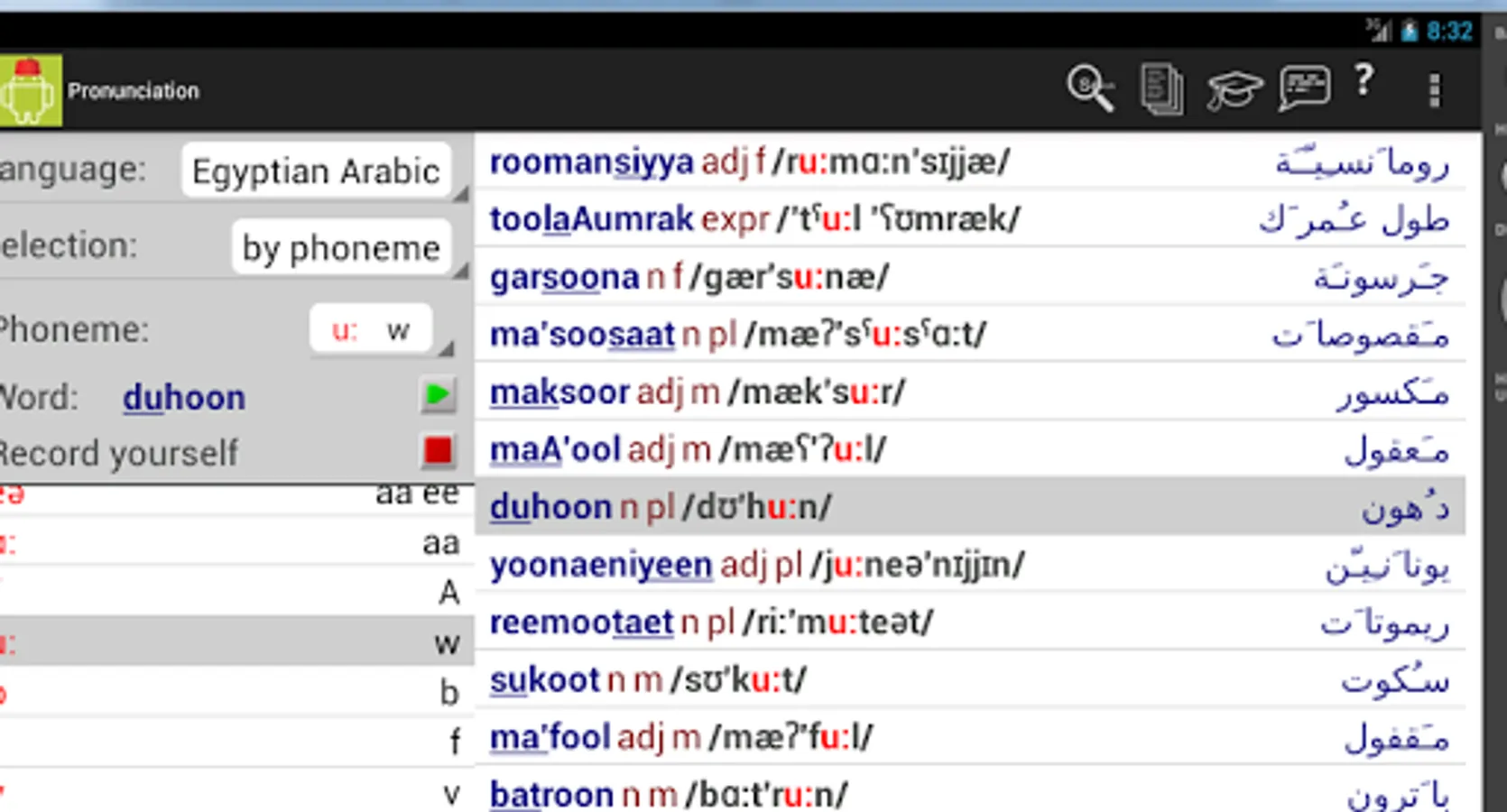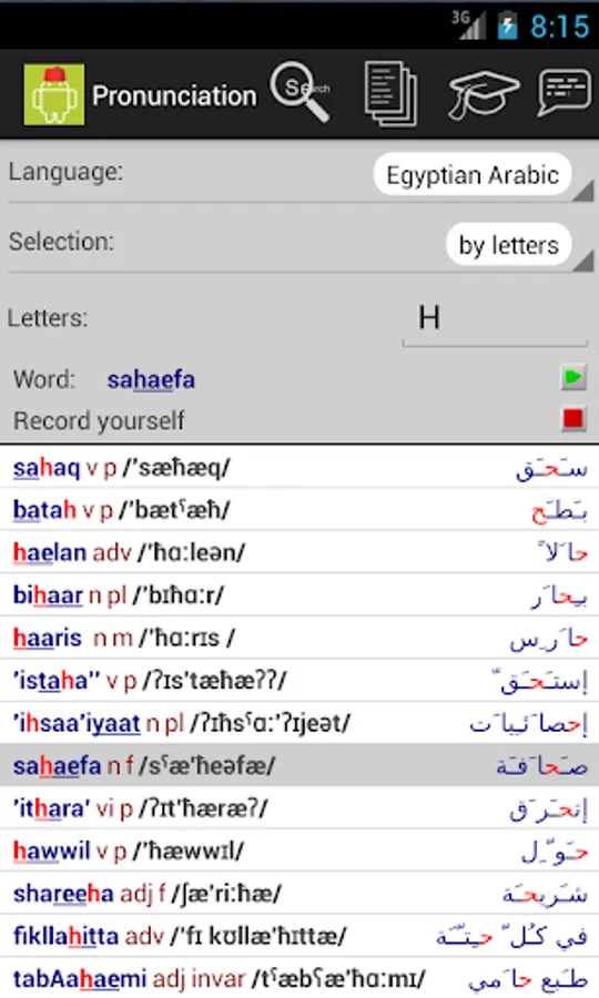 The pronunciation tool is equally useful for people learning Egyptian Arabic and people learning English. You can select groups of words with similar letters or phonemes (sounds), hear somebody saying the word then record yourself and compare yourself to the correct pronunciation.