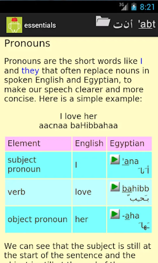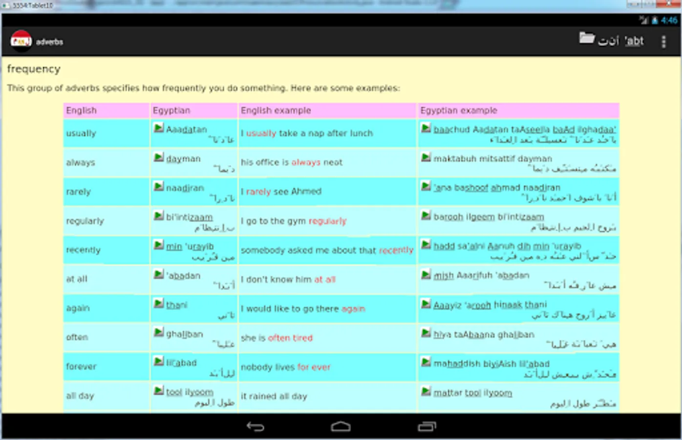 The grammar document gives a complete summary of Egyptian arabic with examples and recordings.