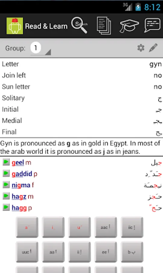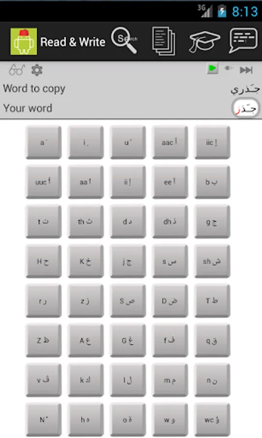 The reading and writing tool first introduces the letters of the Arabic alphabet, then tests your knowledge by showing and/or saying random words and checking that you can write them correctly.