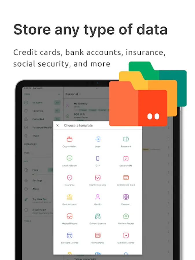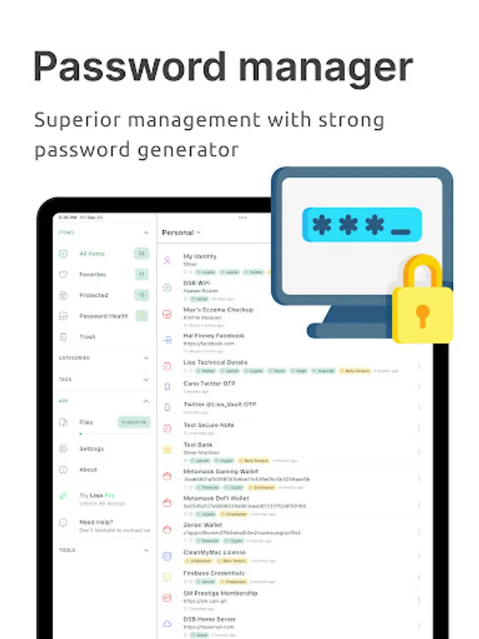 Leverage Liso's secure data vault to store a wide array of critical data, including login credentials, passwords, email accounts, crypto wallets, seed phrases, 2FA/MFA codes, secure notes, debit/credit cards, bank accounts, medical records, driver's licenses, software licenses, social security numbers, and much more.