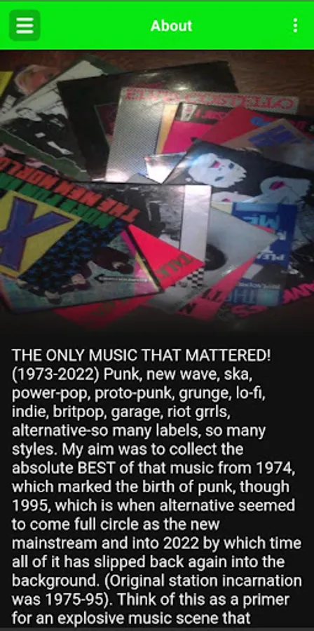 THE ONLY MUSIC THAT MATTERED! (1973-2022) Punk, new wave, ska, power-pop, proto-punk, grunge, lo-fi, indie, britpop, garage, riot grrls, alternative-so many labels, so many styles. My aim was to collect the absolute BEST of that music from 1974, which marked the birth of punk, though 1995, which is when alternative seemed to come full circle as the new mainstream and into 2022 by which time all of it has slipped back again into the background. (Original station incarnation was 1975-95). Think of this as a primer for an explosive music scene that unjustly received very little play on the radio. Since I grew up in an era of great DJs who took pride in their song sets, I do my best to arrange the tunes in a way that honors their style. There may not be equal representation because some bands made 20 great songs, which should all be heard, while others only came up with 1 or 2 gems. Nor do all the songs decreed new wave hits by the radio industry get airplay on this station (although I have my share of guilty pleasures). Some pre-1973 influential songs have been snuck in as well. While I admit that I do have an aversion to most techno and ballads, and I certainly cant tell the difference between a brilliant lyric and an inane one, I DO know a great tune when I hear it. So sit back and listen to the brilliant melodies emerging from the wall of guitar sound, or smile at the killer pop hooks, or dance to the irresistible beat but remember - PLAY IT LOUD! (OK maybe Loud-ish as I have hearing aids now).