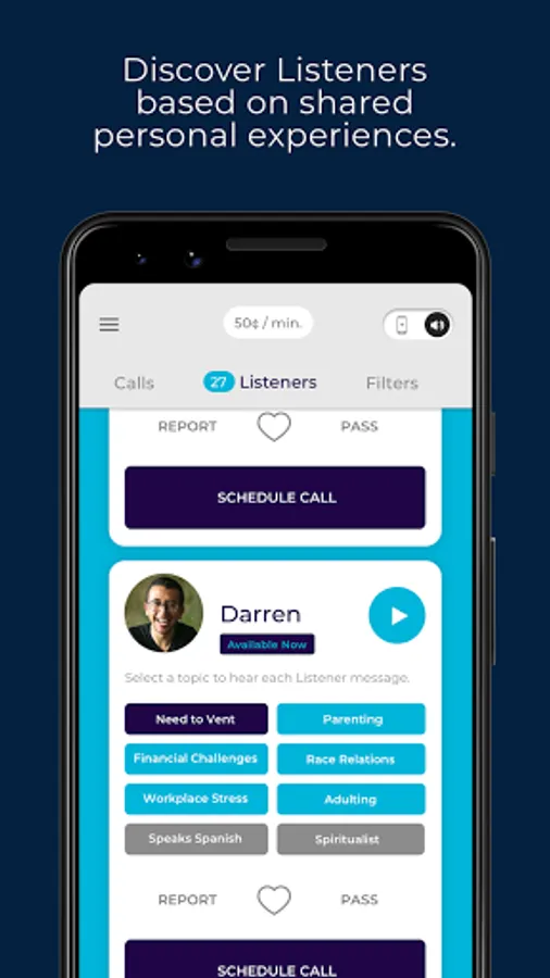 We match Listeners who share a connection to what you are experiencing. You choose who you want to connect with based on their recorded profile.