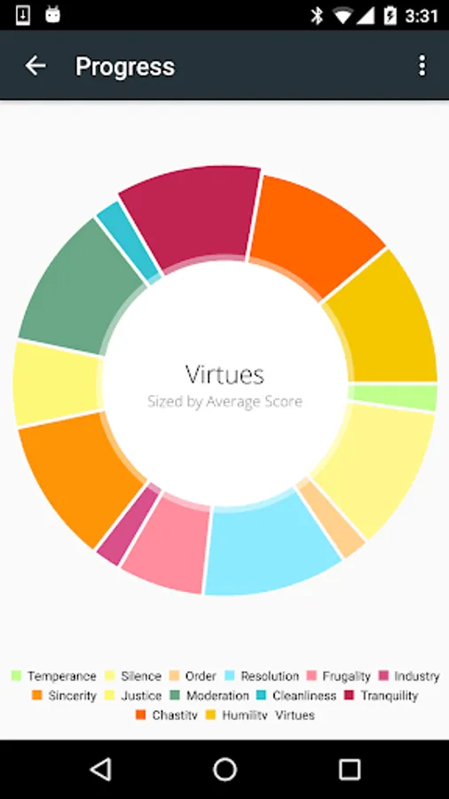 At the end of each week, a notification will remind you to choose a new primary virtue, just like Ben Franklin did. Eventually, you will begin to see the change with the visual progress reports built into the app. The progress screen can quickly help you identify trouble areas, and accelerate the life-long chore of self-improvement.