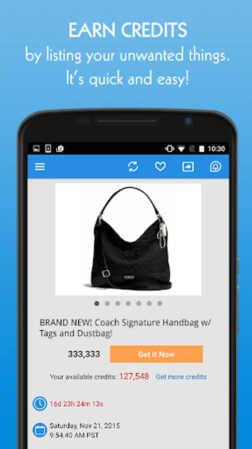The mobile app makes it a snap to create auctions and offer up items for sale. Simply take a photo with your device, add some details, and post it to Listia instantly. The Listia app will show you what nearby users are trading, let you buy and bid on things you want, and notify you when you're outbid or an item you want is ending.