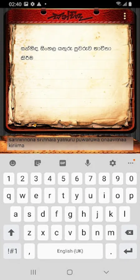 * Enable Sanhinda Keyboard to type anywhere (Settings > General management > Language and input > On-screen keyboard > + Manage keyboards > සන්හිඳ)