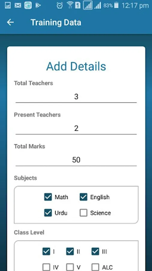 An application by which DT's of the Literacy & Non Formal Education Department can assess and mark the skills of the teachers.