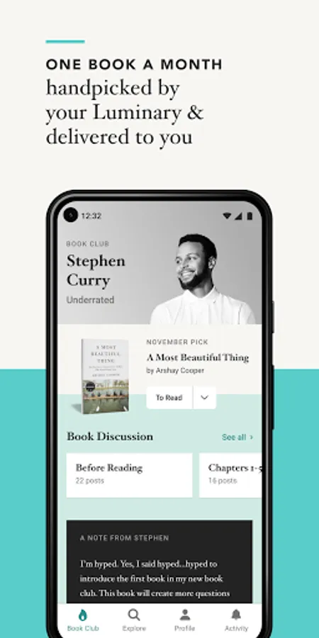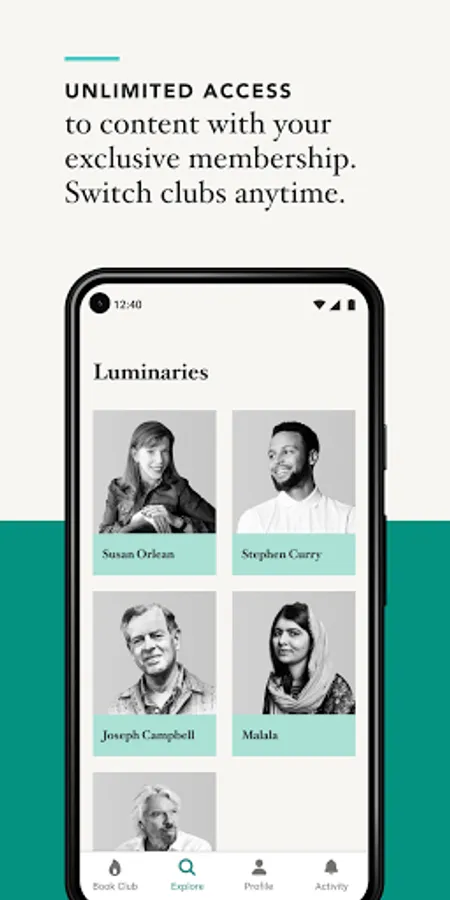 Want to explore? You can also view all of the content in all the other book clubs, from Richard Branson’s adventurous anecdotes to Stephen Curry’s barrier-breaking insights. Change clubs or skip a month at any time.