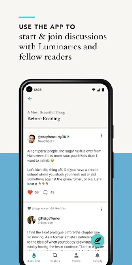 As you read, share the experience with your Luminary and like-minded readers. Open the app to post notes, quotes, questions, and ideas about the book in your club.