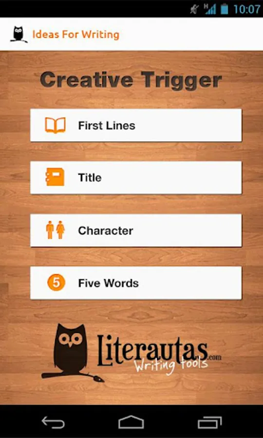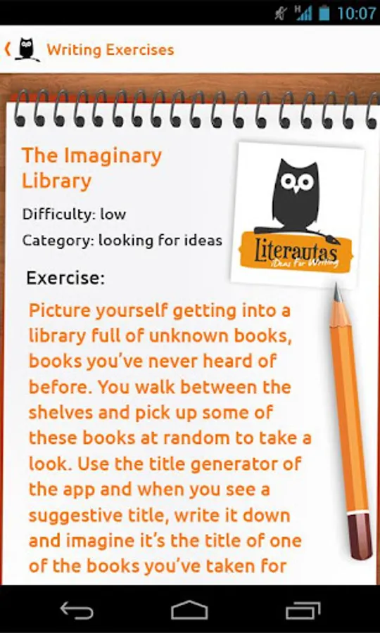 A complete writing workshop with a lot of exercises organized by category and difficulty, for you to improve your writing and get the most of the creative triggers in the app.