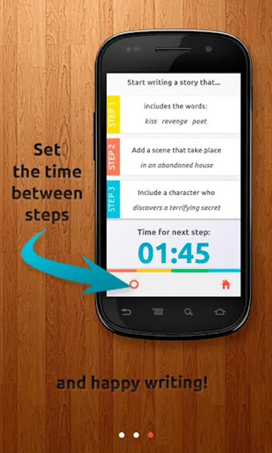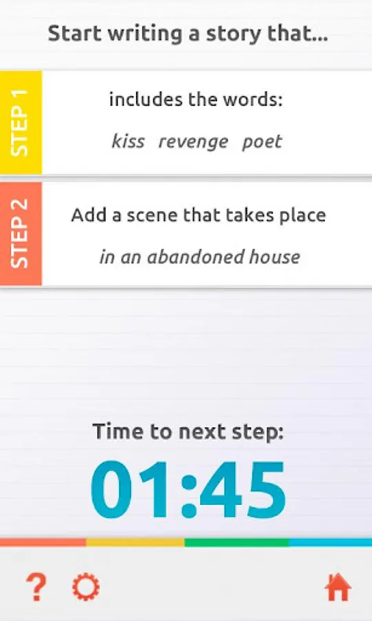 It's easy. You just have to press "start" and the app gives you the first prompt to start writing your story. Choose the one that you most like and fire up your writing. Then, every minute (or the time you choose in the app settings) the app will give you a new prompt for you to add new ideas, words, characters, sentences, places or actions to the plot. Quite a challenge to turn your writing into a game!