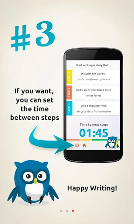 It's easy. You just have to press "start" and the app gives you the first prompt to start writing your story. Choose the one that you most like and fire up your writing. Then, every minute (or the period of time you choose; you can set it in the app settings) the app will give you a new prompt for you to add new ideas, words, characters, sentences, places or actions to the plot. Quite a challenge to turn your writing into a game!