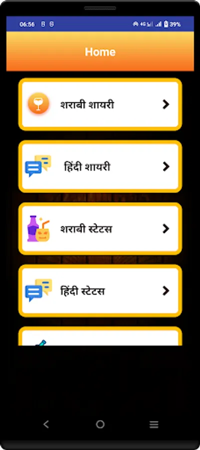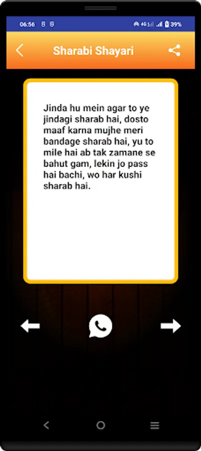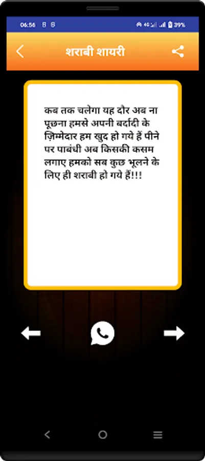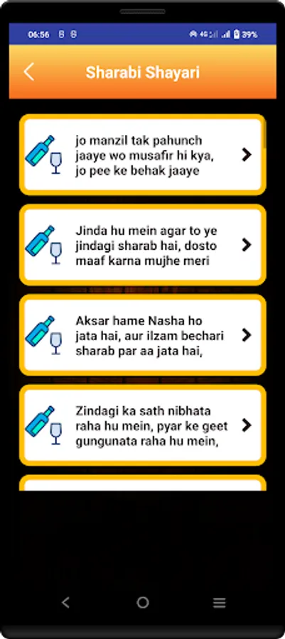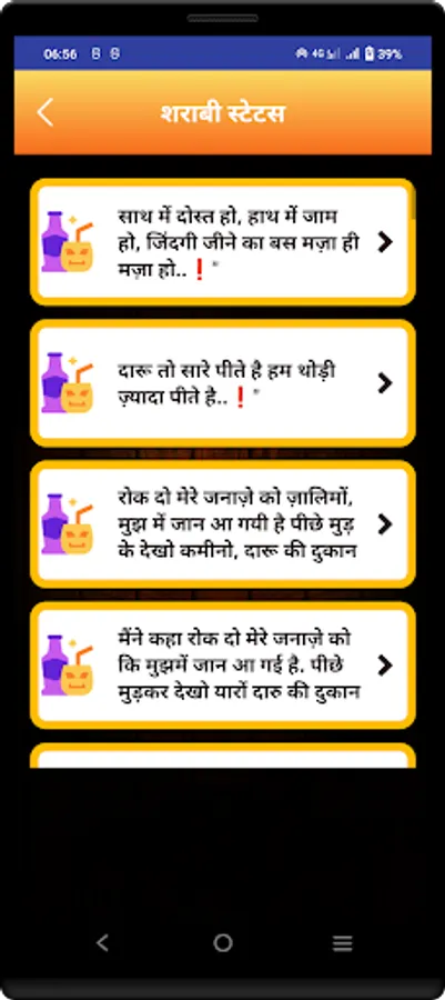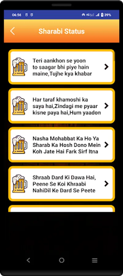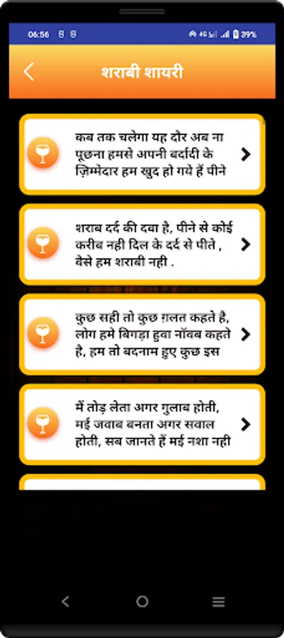 This App contains new shayaris in the market.also our developers works hard to update database so that you can have new shayaris and quotes in the market.app is totally offline so that users can use it without internet.users are provided share and copy facility.hope you like our work.