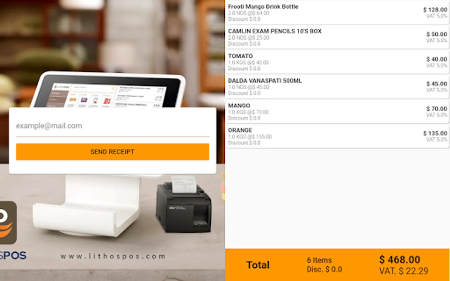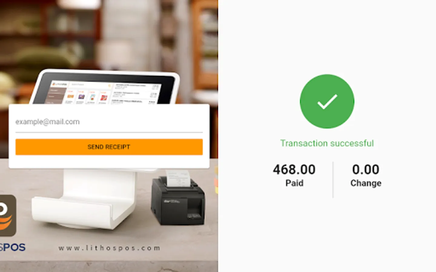 Lithos POS CDS (Customer Display System) is an interactive customer-facing screen app, that displays the details of customer’s order and allows to enter email address for digital receipts.