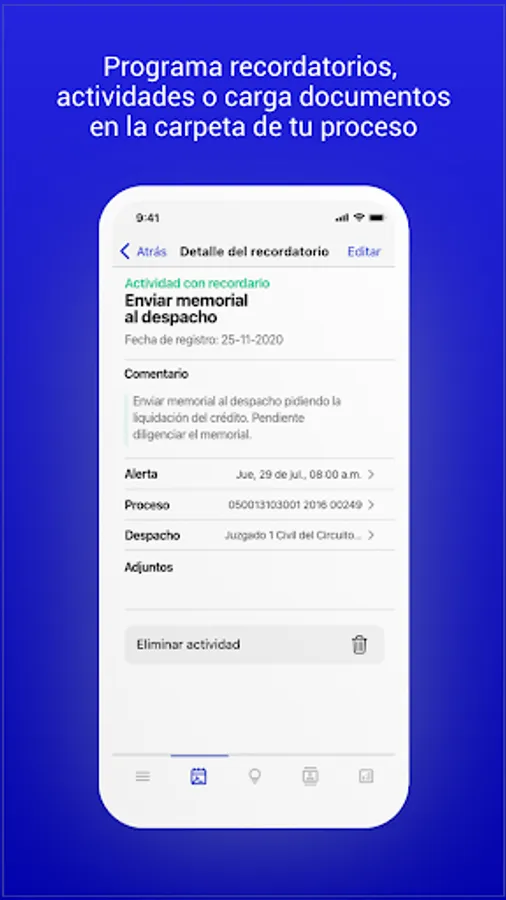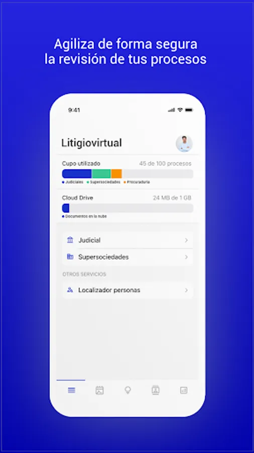 In our app you can access the Electronic Statements and Providences of more than 120 municipalities and cities. It is simple, reliable, and easy to operate. You can schedule reminders on the calendar, upload documents and receive alerts about the notifications of your judicial processes or before the superintendency of companies. You can also access all this from your computer, accessing from our website.