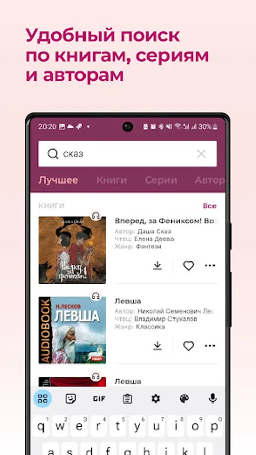 We understand how important it is to quickly find the literature you are interested in. In the application “Litnet. Audiobooks" you can easily find works by title, author, genre and other parameters.
