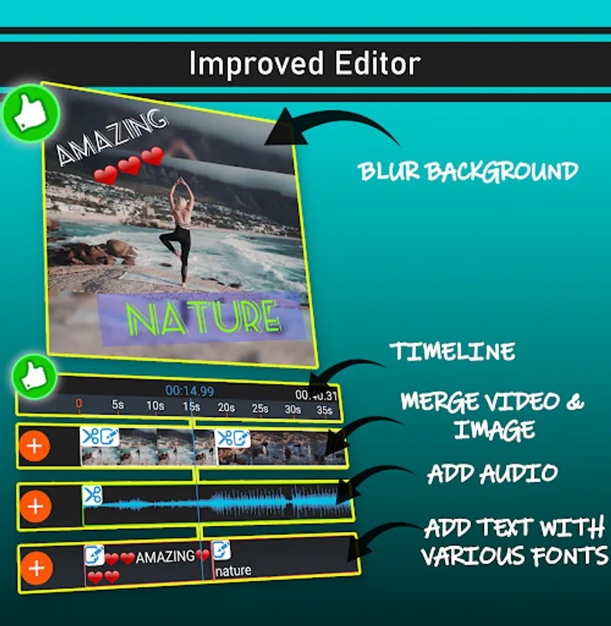 Easy drag and drop feature in editor gives you ability to reorder your videos ,photos , texts and audios.