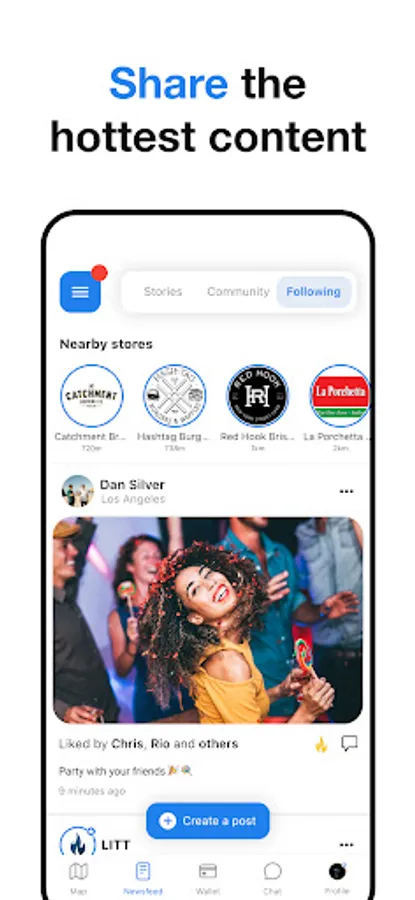 Browse the LITT social network Newsfeed to stay up to date with your friends and followers, post, chat and share AR stories, connect with local businesses and events, and discover more about your neighborhood.