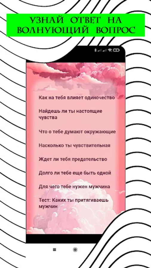 Also, in the application, you can take tests and find out if the boundaries are respected in your relationship, and what kind of men you attract. Divination for love by name. Fortune telling.