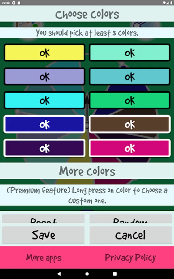 Set an "ok" in all the color you want to display in your wheel. Clicking over a color switches it on/off.