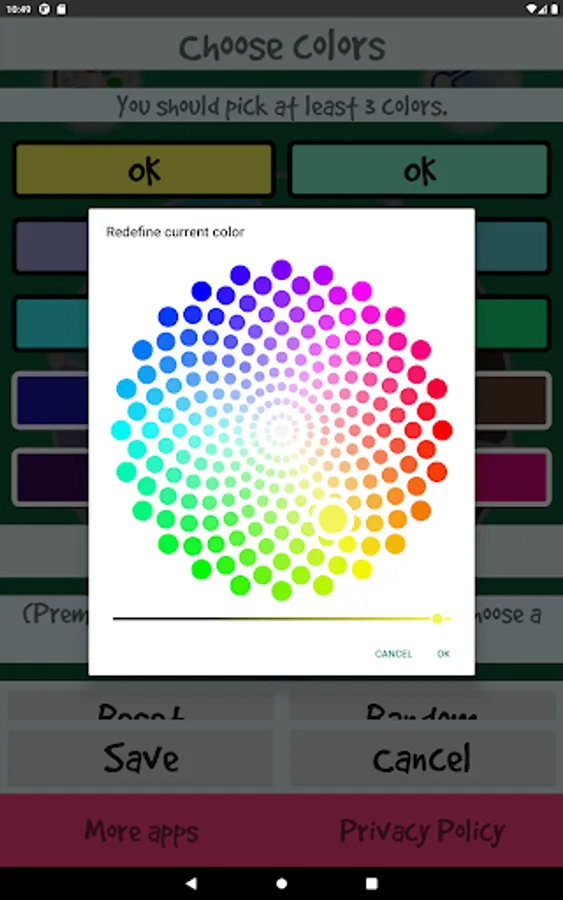 - Long click on a color: Allows you to redefine selected color slot with a color picker.