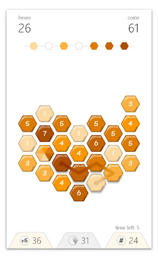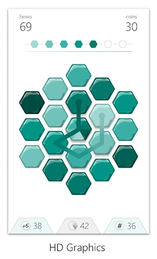 The goal in this game is to connect as much hexagons as possible with a single swipe. Hexagons can only be connected from lighter to darker colors. Start the swipe on some hexagon with lighter color and start adding nearby hexagons with darker and darker colors. It might sound easy, but it can be surprisingly challenging. The more hexagons you connect the more coins you'll get.