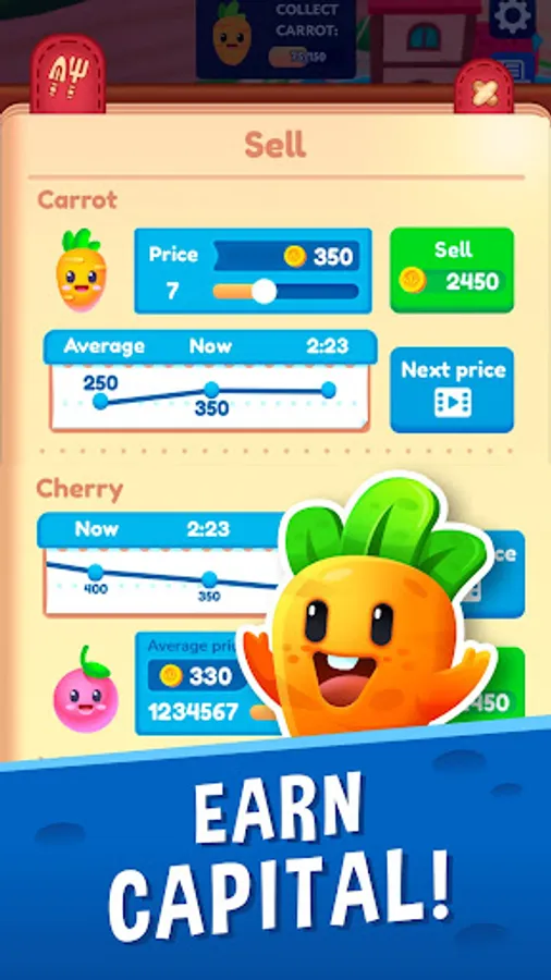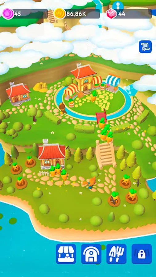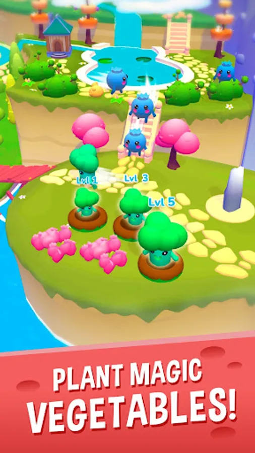 You’ll get an island to plant trees and veggies. To proceed in the game, you’d need to upgrade the veggies, complete the tasks, level up and collect the money. All those steps will give you a possibility to unlock more and more islands gradually empowering your business. Oh, and let's not forget our Benjamin, he'll be your guide in this magic cute veggie world.