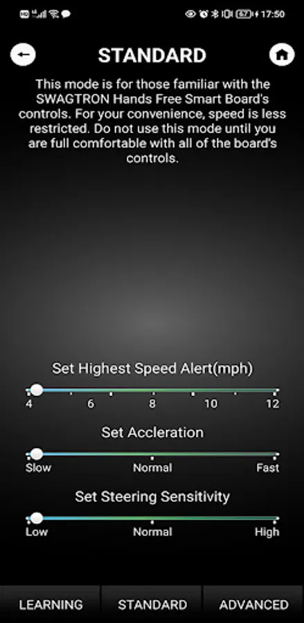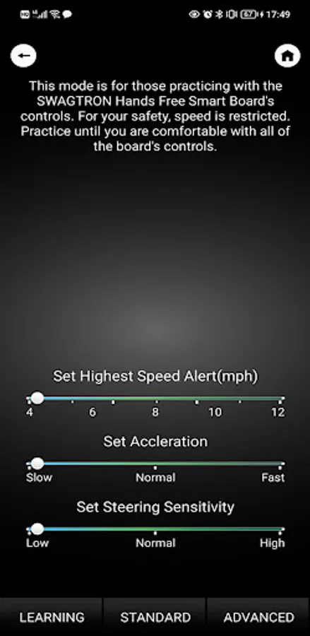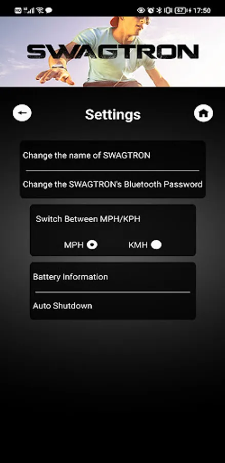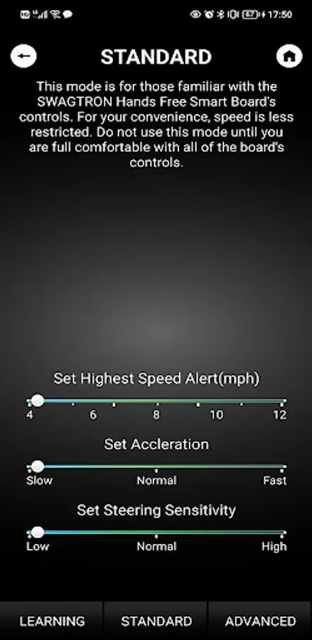 The SWAGTRON App is exclusively designed for use with the SWAGTRON T3 and the SWAGTRON T6. Through a Bluetooth connection, the app can show information about the board's temperature, battery status, and much more. You can now simply use your mobile device and choose from three different riding mode selections to fit your experience level, including the one only available through the app.
