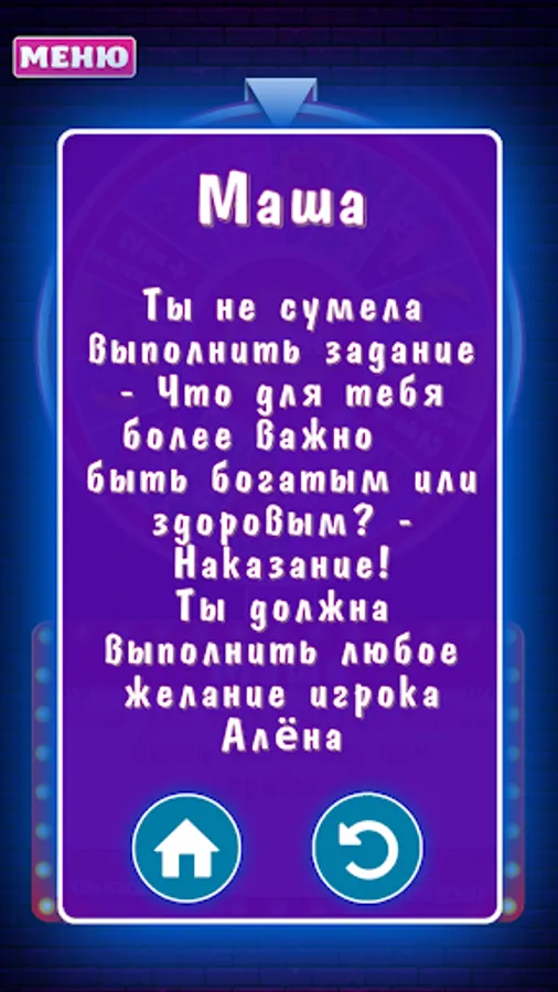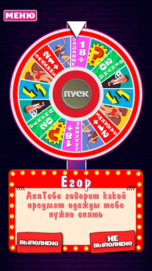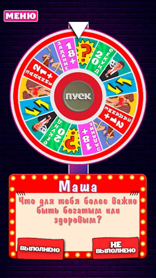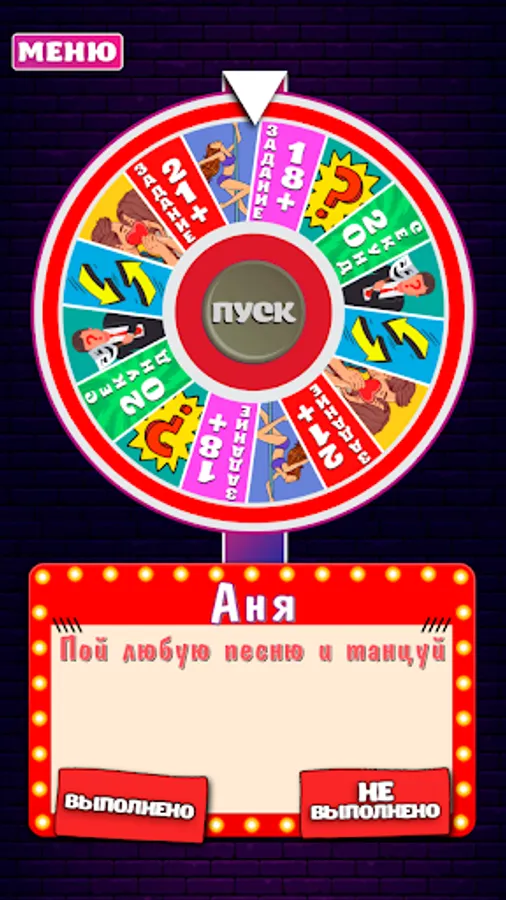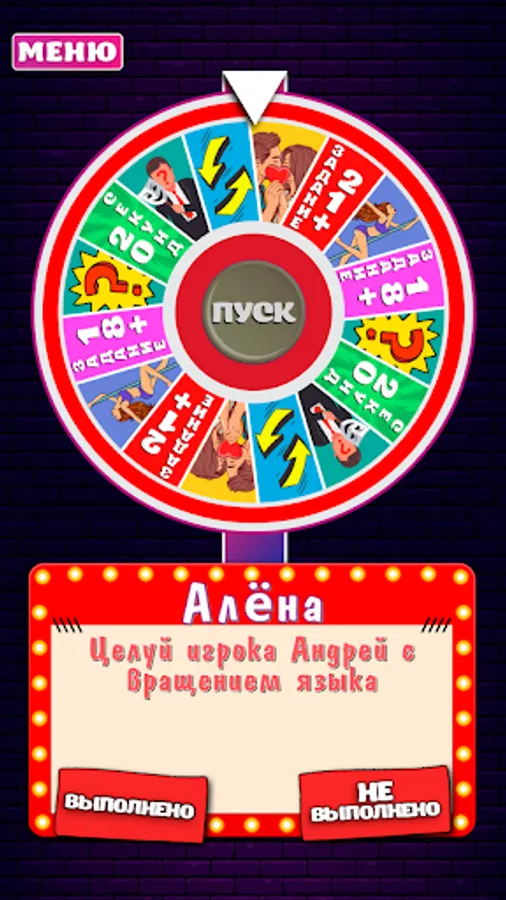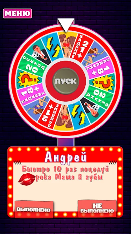 Roulette desires for adults, This is an exciting game for a group of friends and an adult company. Spin the wheel and get questions and tasks on different topics and tastes. For couples in love, or for those who like to play pranks, a special 21+ mode is provided, with very frank questions and tasks!