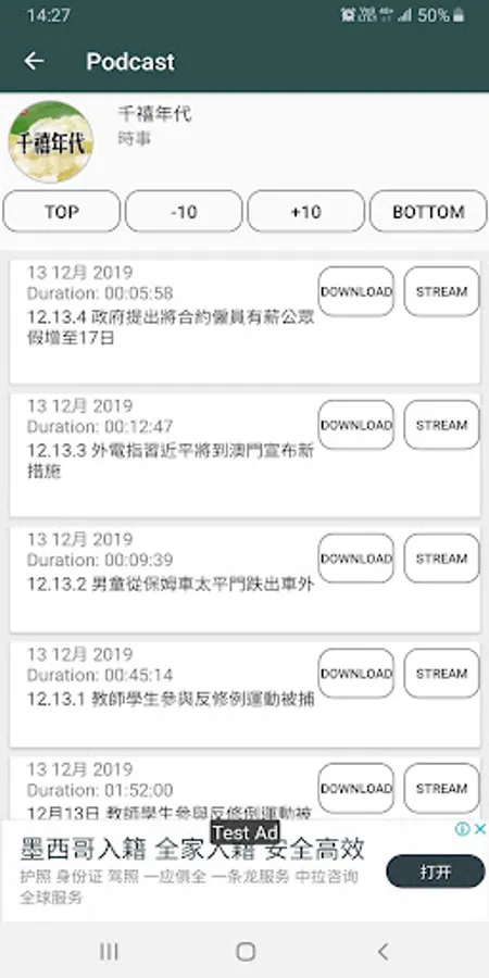 Write permission will be asked if you want to download podcast file at the first time. Downloaded file will be stored at Podcasts folder of your phone. You can use "Stream" function to listen as well.