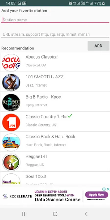 If you know the URL of new streaming radio stations, you can add your own favourite stations. Current, support http, rtmp, mmsh, mmst with mp3, asx, pls, m3u8, m3u, flv format.