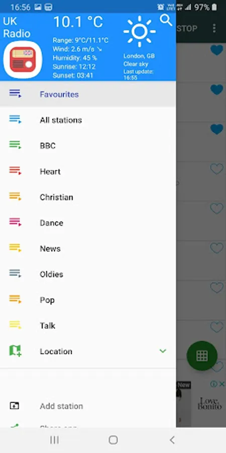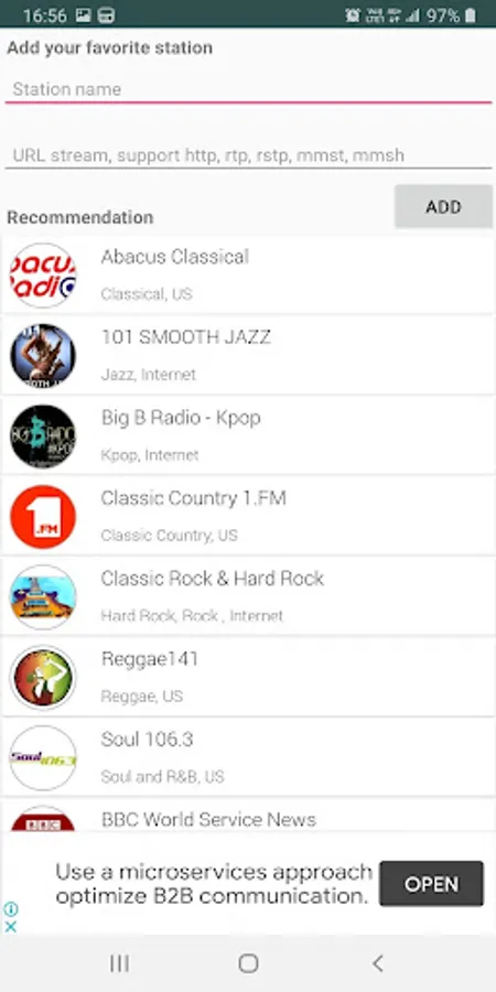 We also provide a simple way to allow you add your favourite channels. Just use the "Add station" function and enter the URL you can have your own collection. Currently mp3, aac, pls, asx, m3u, m3u8 are supported.