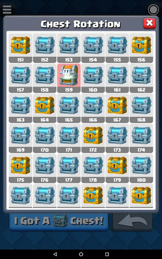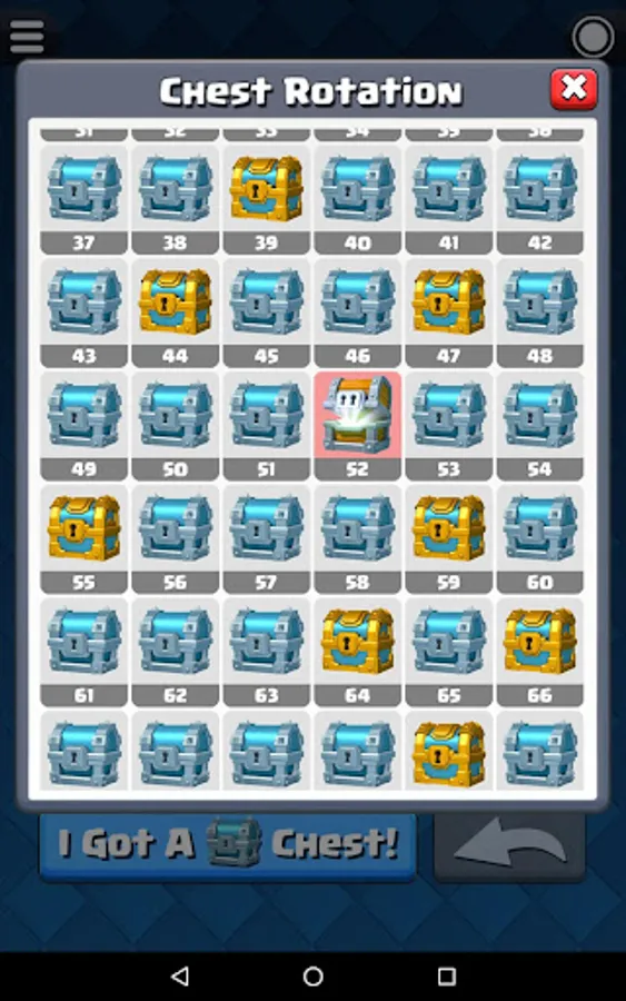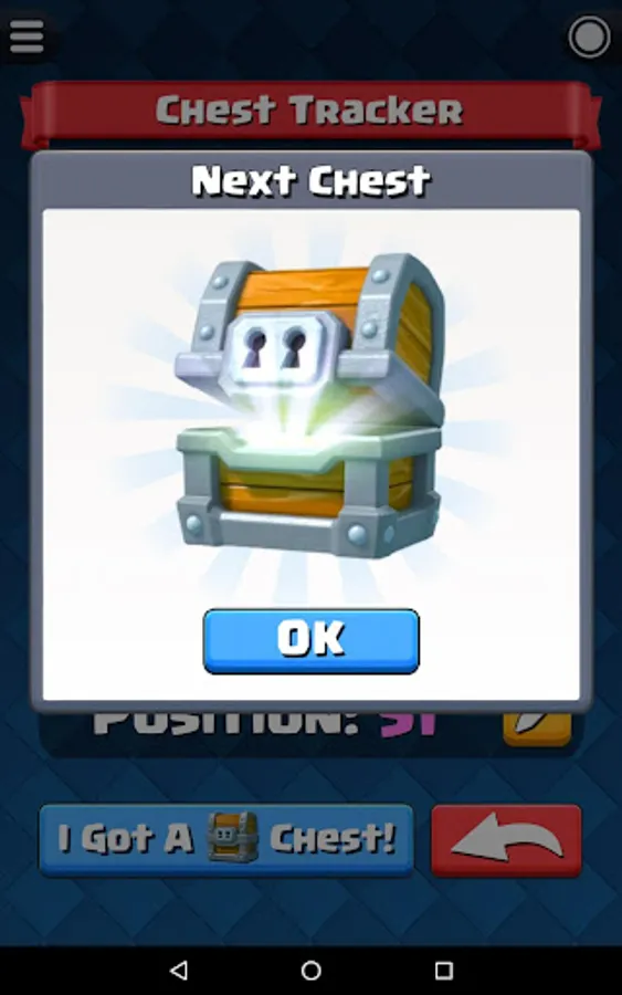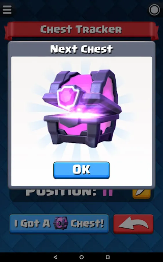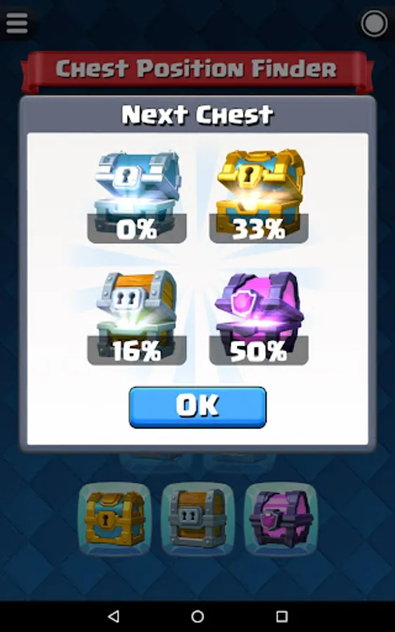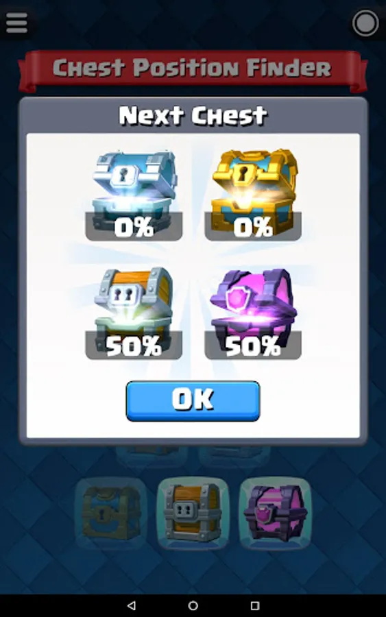 DISCLAIMER: This app acted as a fan-generated guidance app for the game Clash Royale by Supercell. This is unofficial and not associated by Supercell. All chests images, background, popup are belong to Supercell. For more information, see Supercell's Fan Content Policy http://supercell.com/en/fan-content-policy/