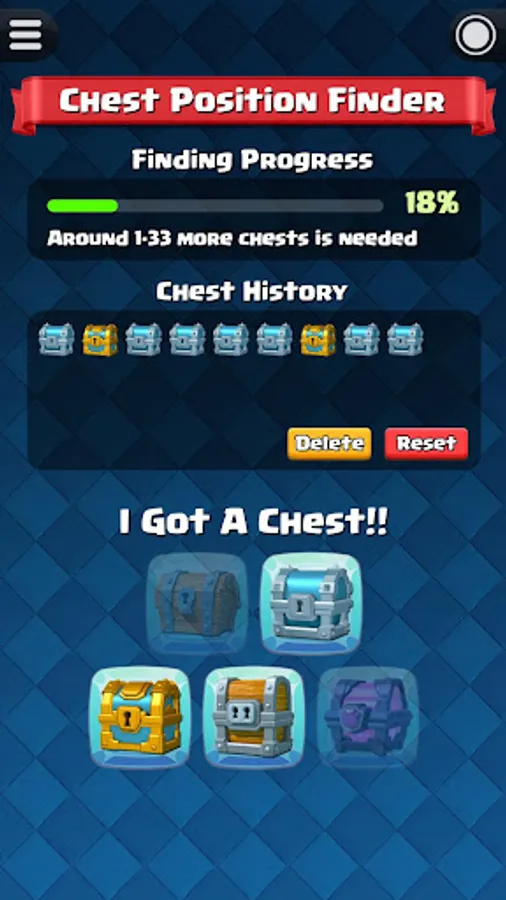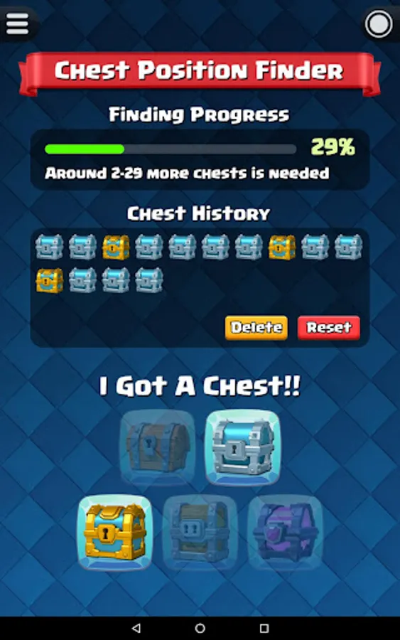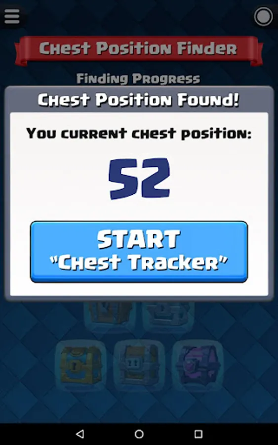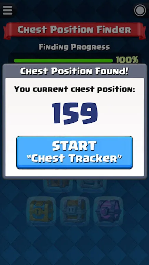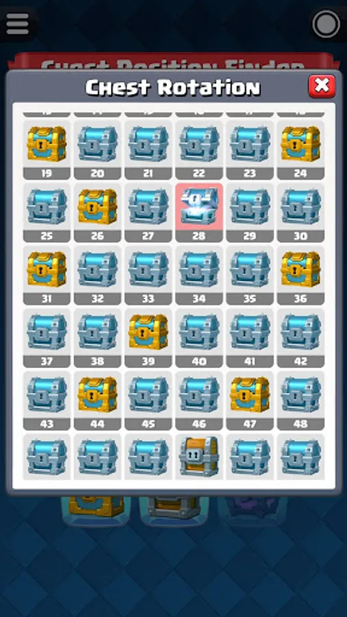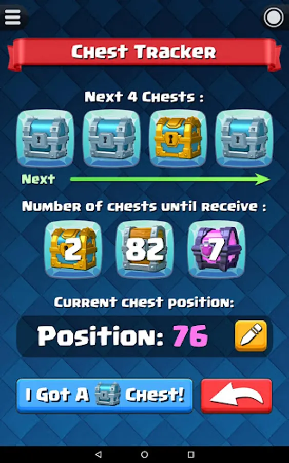 Before start using the chest tracking, you must know your current chest position in Clash Royale. I believe that most of you have already forgot how many chests you have opened so far. No worry, we have integrate a feature named "Chest Position Finder" to help you find out your current chest position in Clash Royale.