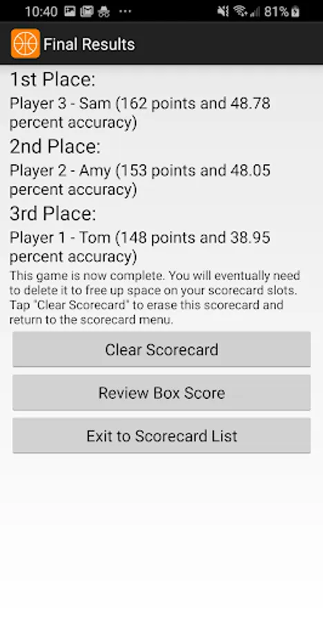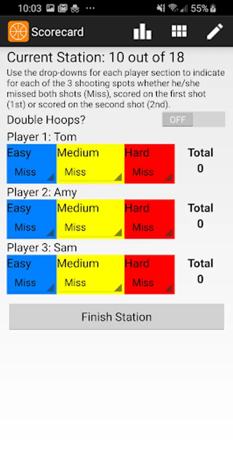 In this never-before-seen unofficial BANKSHOT Basketball scorecard app, you can use convenient touch controls to track the scores of every player in a game of BANKSHOT Basketball, using dropdowns to indicate the shooting outcome of each player at every shooting spot of the current station. The scoring data of a game in progress is saved to the app automatically after each station is completed, and you can also load it back at any time, allowing you to conveniently suspend and resume BANKSHOT Basketball games in case the players cannot complete a game in one session.
