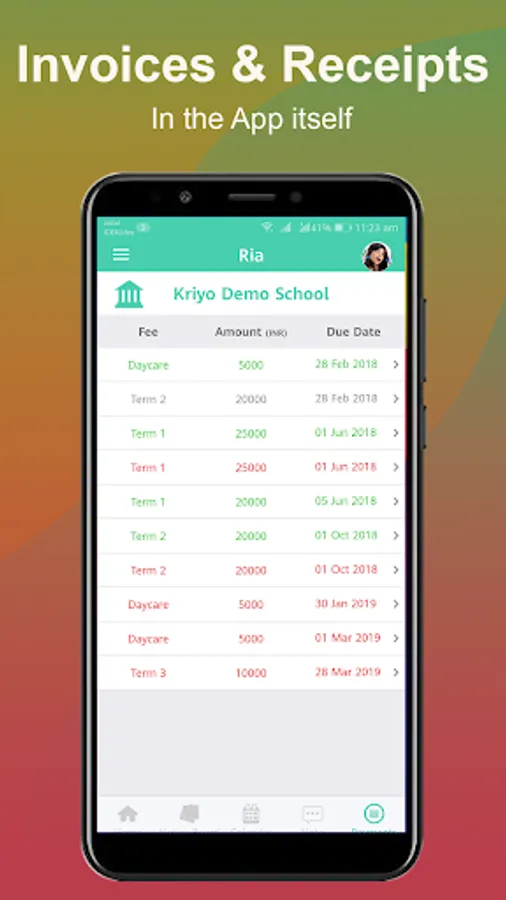 • Invoices, Payments & Receipts: You can now view all the Fee Invoices sent by the school.